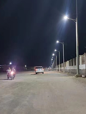 這是中東地區(qū)最新的項目,位于也門哈德拉穆特市。該項目選擇的模型是80W的和諧二體化太陽能路燈,安裝在8M的燈桿上,整體采用高轉(zhuǎn)化率單晶硅太陽能板、高光效LED模組、智能電池管理系統(tǒng)、高效控制器。蓄電池和控制器都集成在太陽能板上,同時LED采用高強度進口PC光學透鏡和蝙蝠翼型配光設計,提供均勻布光。